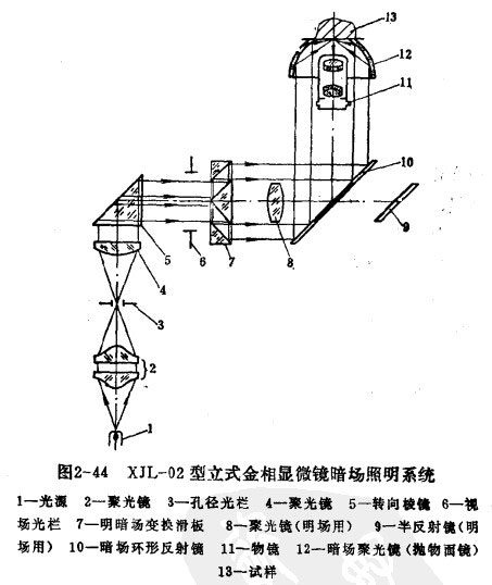 圖2-44為XJL-02型立式金相顯微鏡的暗場照明系統。其中由光源到視場光欄部分和明場時完全一樣,不同的只是從視場光欄到試樣表面這一部分。