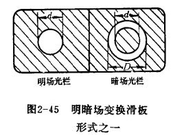 明暗場變換滑板,老一些的式樣是一塊玻璃板上有兩個光欄(明場光欄和暗場光欄),如圖2-45所示。明場光欄是中間透光的回孔(圖2-45左邊),圓孔直徑為d,暗場光欄是一個環形透光帶(圖2-45右邊)。明場照明時將明場光欄推入光路;暗場照明時將暗場光欄推入光路,得到內徑為d外徑為D的環狀光束。但是這種形式的暗場光欄要求入射平行光束直徑不小于D才行。比較新式的一種是國產立式和大型金相顯微鏡所用的暗場光欄,它由“內錐,和“外錐”兩個反射鏡構成,圖2-44只畫了剖面圖,要了解其立體形象,只要將該圖繞光軸旋轉一周就行。這種暗場光欄的好處,在于要得到內徑為d外徑為D的環狀光束,只需用直徑為d的平行光入射就可以了,從而給從視場光欄6到光源1之間的一段光路的光學設計帶來方便,當然,除了XJL-02產品外,在“產品中心”金相顯微鏡類別中也有詳細介紹各種顯微鏡的用途及款式。