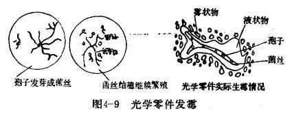 在光學(xué)零件上呈現(xiàn)蜘蛛絲狀的東西時(圖4-9),就是光學(xué)零件生霉了。霉是由霉菌繁殖引起的。霉菌是一種微生物,主要有曲霉、青霉、其次是毛霉、根霉及不完全菌幾種。霉菌要繁殖,必須具備下列四個條件: