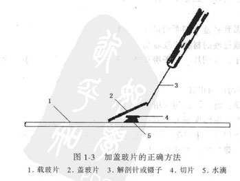 (4)用鑷子夾取蓋玻片,使蓋玻片的一邊在觀察材料的左邊,斜,與水滴接觸,慢慢地放下蓋玻片,操作時防止蓋玻片孩然下降,以免產生氣泡防礙觀察的效果(圖1-3)。