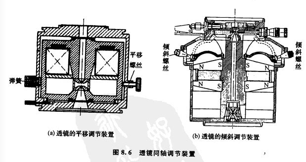 圖8.6中(a)是透鏡的平移調(diào)節(jié)裝置,如果定義磁透鏡的軸心(稱(chēng)為中心光軸)為Z軸,通過(guò)調(diào)節(jié)在XY平面中相互垂直的這樣兩個(gè)平移螺絲可以使相應(yīng)透鏡在整內(nèi)相互垂直的兩對(duì)傾斜螺絲,可以使上部透鏡在180°立體角內(nèi)傾斜,這樣通過(guò)調(diào)節(jié)這些螺絲,可以把整個(gè)電子偏光顯微鏡的各級(jí)透鏡調(diào)節(jié)至與中心光軸重合,在整個(gè)調(diào)節(jié)過(guò)程中。不論平移還是傾斜都不能有漏氣點(diǎn)。可見(jiàn)其幾何裝配要求之高。